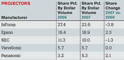 InFocus grabbed the most market share, but its share dropped in the first half of 2007 over the year-ago period,while in the No. 2 slot, Epson saw an increase.