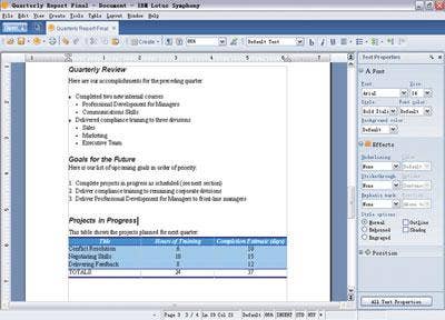 Symphony consists of word processing, spreadsheet and presentation applications. Based on the Open Document Format standard, Symphony saves all documents by default to that format. It can open and edit documents created under OpenOffice and other applications that also follow ODF. Symphony can also open and edit all Office documents saved in the older .doc format. Documents created in Office 2007 with the newer .docx (.xlsx and .pptx) formats can't be opened under Symphony.