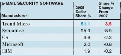 Trend Micro, with its ScanMail solution, accounted for more than 50 percent of all revenue through distributors last year in e-mail security software; it also gained some share. Symantec saw its share drop significantly, but the company also focused more on selling full security suites than unbundled e-mail security products.