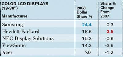 Samsung maintained its top spot in 2008, with HP showing the most market-share gain. ViewSonic had the biggest slip and was passed by NEC Display Solutions, which took the No. 3 spot.