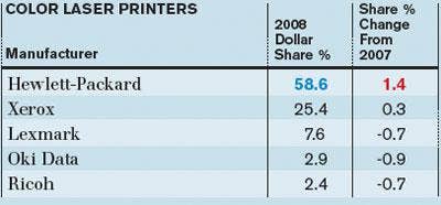 HP dominated this category even more than MFPs and combined with Xerox to account for more than 80 percent of all dollars generated in 2008, according to NPD.