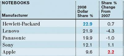 HP claimed the top spot from Lenovo in 2008, while Panasonic finished a close third. As with desktops, Apple picked up the biggest market-share shift.