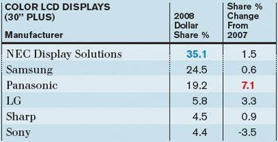 NEC continued to shine in this category, accounting for more than one-third of all dollars sold through distributors in 2008. Panasonic made the biggest leap, from 12.1 percent share in 2007 to 19.2 percent share last year.