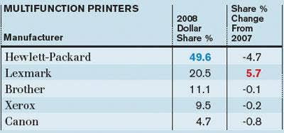 HP lost some share in 2008, but still accounted for nearly half of all revenue in the MFP category. Lexmark made the biggest market-share strides during the year.