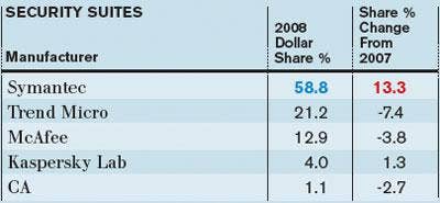 Symantec, with its increased focus on suite selling, led the way with nearly 60 percent of all dollars sold through distribution last year. It also had a sizable jump in share compared with 2007.
