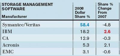 Symantec/Veritas saw its share percentage slip last year, but still combined for more revenue through distribution than all other vendors combined. IBM and Acronis showed some share gains.