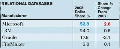 Microsoft continued to dominate the relational database category with its SQL Server product line. Microsoft and IBM, along with FileMaker, showed some slight share gains in 2008, while Oracle slipped a bit.