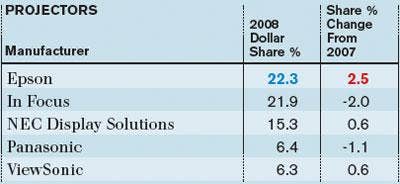 Epson passed InFocus as the top projector vendor in 2008, in terms of dollars sold through distributors. NEC gained some slight share to remain a solid third.