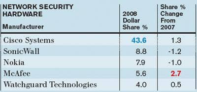 Cisco Systems accounted for more than 40 percent share in 2008, while also gaining share compared with its next two closest competitors. McAfee was a distant fourth, but saw its share increase significantly last year.