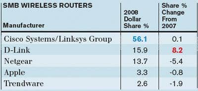 Cisco (and Linksys Group) also dominated the wireless router market, accounting for 56.1 percent of dollars sold in 2008. D-Link had another sizable gain, passing Netgear in terms of market share last year.