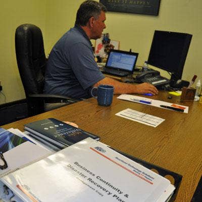 Larry Hedin, HTS' vice president of sales and marketing, works at his desk, which contains the solution provider's disaster recovery and business continuity plan, completed only two weeks prior to the tornado's arrival. The plan helped HTS to more quickly and efficiently offer support for its customers, Hedin said.