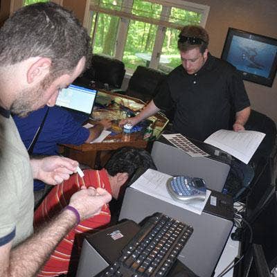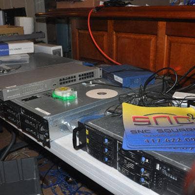 SNC technicians work check on several servers that were set up in Motazedi's basement, creating a temporary NOC for SNC Squared's clients.