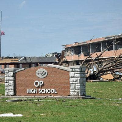 The ruins of Joplin High School stand behind the school's entrance sign, now missing its J, L, I and N. The campus was one of three schools damaged in the disaster. Joplin seniors had graduated just hours before the tornado struck.