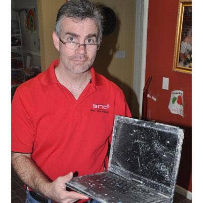 John Motazedi, CEO of SNC Squared, a Joplin, Mo.-based VAR holds a laptop picked from the rubble at one site. The VAR joked that he was going to submit a warranty claim to the vendor. SNC's office was destroyed by the tornado but the VAR was up and running by 2 p.m. on Monday in a virtual capacity. By Thursday at 5 p.m., all his clients were back online.