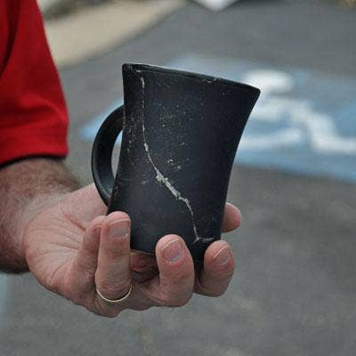 John Motazedi shows off an SNC Squared coffee mug, one of 500 that he had in the office before the storm. After the storm, he's found three of them, and views the other 497 now scattered who-knows-where as "free advertising all over town."