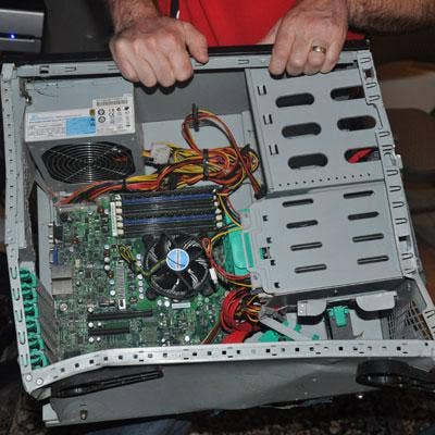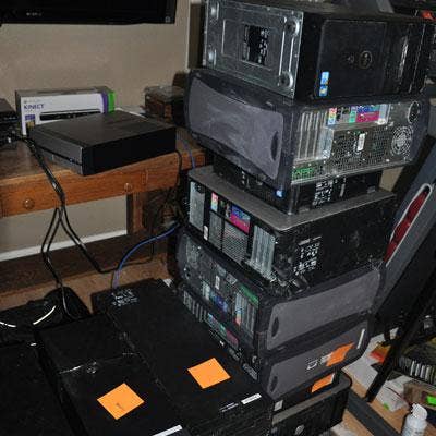 These servers were salvaged but await a check-up from a technician to see if they're still operational. The three on the left were in the middle of being tested