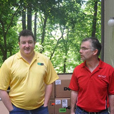 Motazedi, at right, explains how Craig Hillyard, CEO of Network Data Services, a Little Rock, Ark.-based VAR and fellow member of Heartland Tech Groups, drove to Joplin to spend a week helping one of his peers. Hilliard, left, was instrumental in helping SNC Squared get back up and running, Motazedi said.