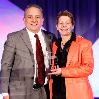 In the category of projection display, we recognized an LED technology that's rated to deliver 20,000 hours of lamp life at extremely low power consumption. It's packed into a 3-pound device along with HDMI and other inputs, one gigabyte of file storage plus SD and USB inputs for presentations without a PC, 3D-readiness, automatic keystone correction and integrated speakers. It's a portable LED Projector with widescreen viewing and incredibly sharp and vibrant images. We congratulate ViewSonic for its PLED-W500 ultra projector and invited director of sales Colleen Brown to receive the award.