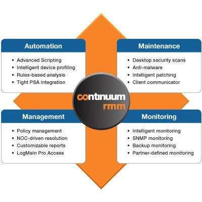 Backed by Summit Partners, Continuum has developed a gamechanging SaaS platform for MSPs-the company calls it managed services "transformed." Its hosted solution for servers includes the right blend of remote monitoring and management tools backed by 24/7/365 NOC services for a single, unified managed services experience.