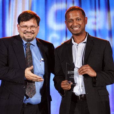 In today's world of high-tech spying by both bad guys and governments, you never know who might be listening to a phone call or intercepting a text. This year's winner in the security category secures perhaps the broadest array of operating systems and mobile devices out there. Secure Enterprise Management 3.0 from NCP adds two-step authentication with self-canceling passwords for remote access and management to virtually any mobile device. Accepting was Imtinan Hussain, NCP's director of sales and business development for the Americas.