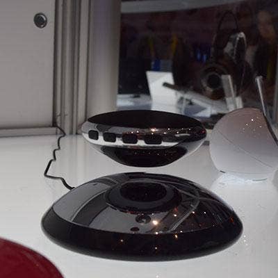 Looking like a mini-UFO, the Air 2 (Air Squared) floating Bluetooth speaker from Axxess CE wins the CES prize for funky. This Bluetooth speaker, which can function as a conference-call system, uses magnets to levitate over its base while the speaker and microphones spin in midair.