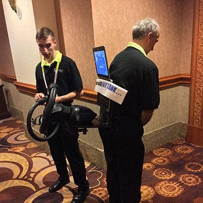 While we waited in line for a CES event on Sunday night, we were greeted by a duo of tech innovators who were pitching their steering wheel sensor product to the media. Mounting the product on your business partner's back was a good way for the two to cover more ground, but it also made for an odd spectacle and the first of many strange scenes we saw at CES.