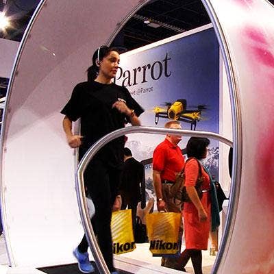 Ever feel like your daily grind is a bit like running on a huge hamster wheel? Don't say that to folks at Paris-based Parrot, whose booth had people jogging on what looked like a giant human hamster wheel while showing off the Parrot Zik Sport wireless in-ear sport headphones.