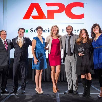 Accepting the award from Robert Faletra for APC were, from right, Leslie Vitrano, director of channel marketing and communications; Shannon Sbar, vice president of channels for North America; Himanshu Patel, senior strategic manager of channel marketing; and, second from left, Gordon Lord, director of channel strategy and IT distribution.