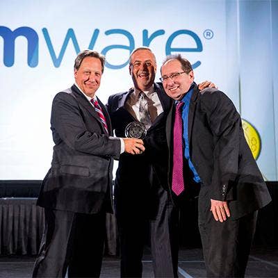 Frank Rauch (center), vice president of the Americas partner organization for VMware, accepted the award from The Channel Company CEO Robert Faletra (l) and CRN Editor, News Steve Burke.