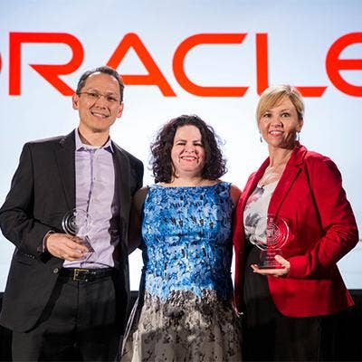 Accepting the awards from Jennifer Follett for Oracle were John Shell, senior director of systems partner enablement, and Kimberly Lasseter, director of the Oracle PartnerNetwork program.