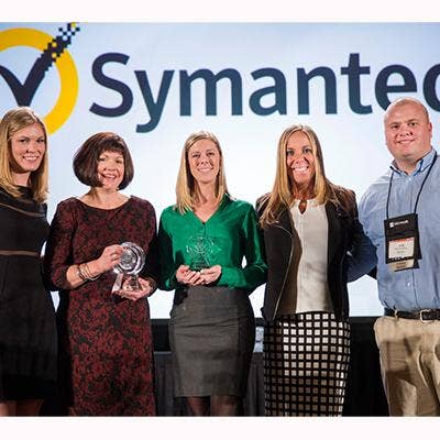 Accepting the awards from Sarah Kuranda for Symantec were, from left, Tricia Atchison, senior director of routes-to-market and channel marketing; Cristen Allard, senior channel marketing specialist; and Katheryne Pelak, senior product marketing specialist.