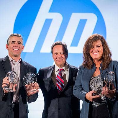 Rich Papaioannou, HP's manager of Channel Marketing in North America, and Colleen Degenaar, a commercial marketing and digital media specialist, accepted the awards from Robert Faletra.