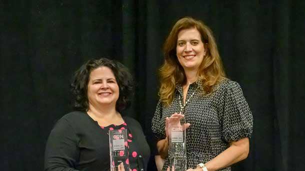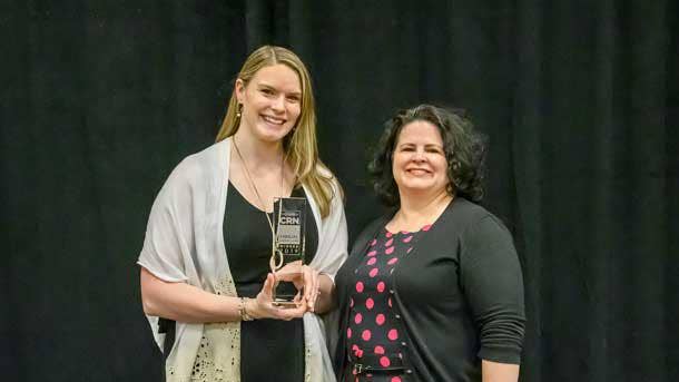 Katie Boeh (left), Channel Marketing and Communications Director, accepted the award from Jennifer Follett, CRN Executive Editor.