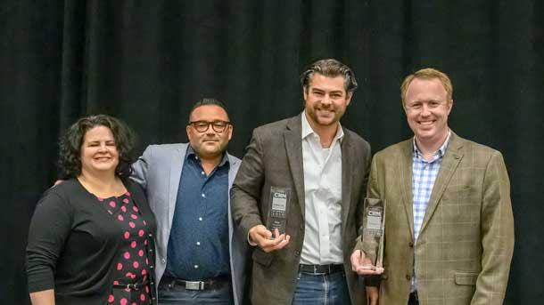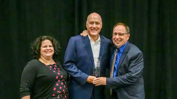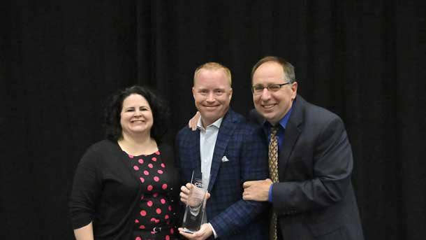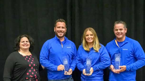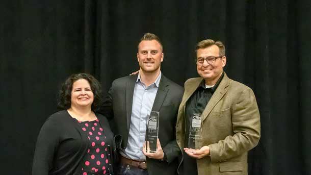 Scott Mann, Vice President of North America Channels (center), and Dave Hallmen, Chief Revenue Officer (right), accepted the awards from Jennifer Follett, CRN Executive Editor.