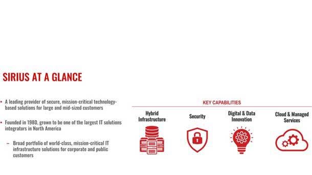 “Sirius has grown to be one of the largest and most well-regarded IT solution integrators in North America,” said Leahy. “They focus on four IT key growth areas: hybrid infrastructure, security, digital and data innovation, and cloud managed services. They are a consultative solution provider across the full ecosystem of leading and emerging vendors.”