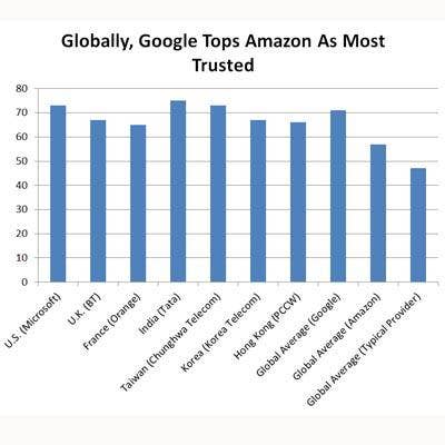 The survey also found that Google beat Amazon as the most trusted cloud provider service on a worldwide basis. In the U.S., Microsoft was the most trusted provider. The survey, by Penn, Schoen and Berland Associates, questioned almost 4,000 IT decision-makers in the U.S., U.K., France, India, South Korea, Taiwan and Hong Kong.