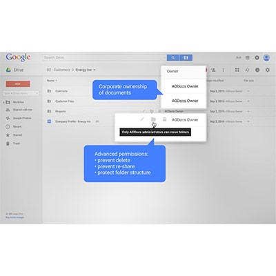 The product transfers ownership of documents to a corporate Google Drive account and implements an automated workflow environment from which it's easy to restrict permission to delete or modify important documents.
