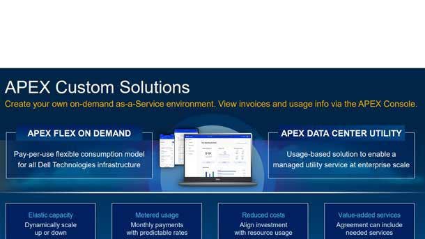 Apex is Dell’s new as-a-service portfolio of offerings that changes how customers and channel partners buy, sell, deploy, manage and maintain Dell’s vast and market leading IT infrastructure products from servers and storage to PCs and cloud.