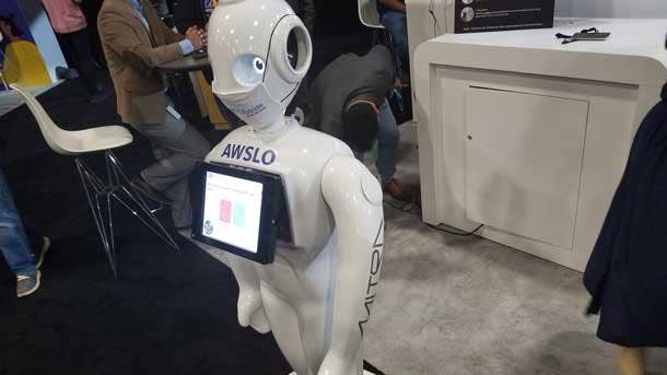 The booth for India-based global systems integrator Wipro featured the 5-foot, humanoid Awslo robot meant to handle tasks such as airline check in, giving tours, checking patient temperature and receiving guests at hotels.