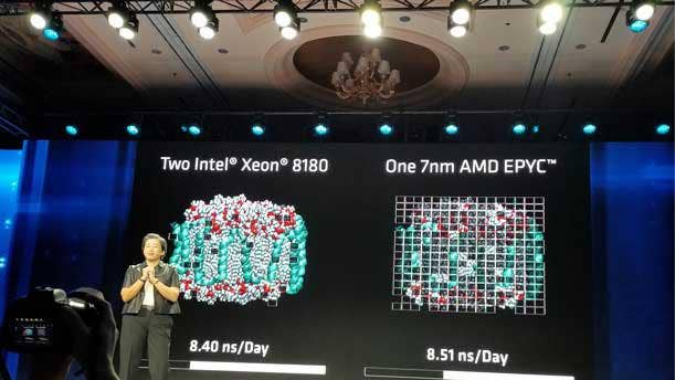After first revealing its 7nm Epyc server CPU last fall, AMD shared more details about the processor, code-named Rome, during Su's Wednesday keynote. Su said the processor line will launch in mid-2019 and provide a 2X increase in performance per socket and a 4X increase in floating point performance over the company's first-generation Epyc CPU, which launched in 2017. In a live demonstration, AMD showed it can run about 15 percent faster than two Intel Xeon 8180 processors.