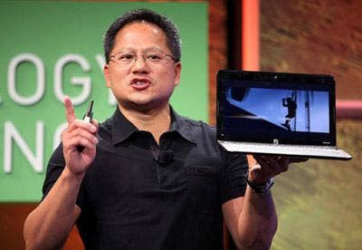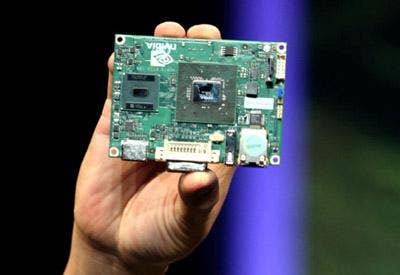 Jen-Hsun Huang holds up an Nvidia Ion motherboard for netbooks and nettops that includes GeForce 9400M on-board graphics at the center of the board and a low-power Atom processor from Intel. Vendors such as Acer and Lenovo have built ultrasmall desktop PCs based on the Atom platform and now Hewlett-Packard is shipping an Ion-based netook, the HP Mini 311. Nvidia boasts that Ion is a far superior graphics platform for Atom-based PCs than Intel's own integrated graphics for Atom systems.