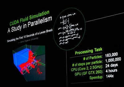 GPU-driven applications such as this simulation of water breaching a levee from Johns Hopkins University point to the real-world, life-saving benefits of parallel programming for graphics processors, according to Nvidia's Jen-Hsun Huang. While Nvidia is popularly known for its acceleration of visual eye candy in video games and the like, during his GTC keynote, Jen-Hsun took great pride in Nvidia's work with researchers at Johns Hopkins and companies such as TechniScan, a maker of a GPU-based early detection system for breast cancer.