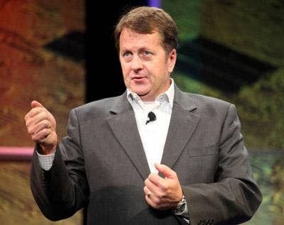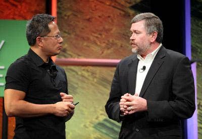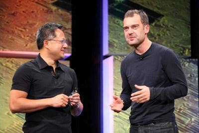Jeffrey Nichols, right, of the Oak Ridge National Laboratory, and Nvidia's Jen-Hsun Huang discuss the new supercomputer project at Oak Ridge that will utilize next-generation Fermi graphics processors to make a run at the Top 500 Supercomputers list next year. The Oak Ridge "Jaguar" supercomputer is expected to deliver 20 Petaflops of compute power, an order of magnitude better than the current top supercomputer in the world, according to Nichols.