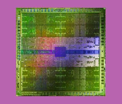 Fermi represents a "radically different way of designing GPUs," according to Jen-Hsun Huang. The next-generation chip, seen here, features three billion transistors arranged into 512 CUDA processing cores that are in turn arranged as 16 streaming multiprocessors with 32 cores apiece. Fermi's CUDA processing cores were designed for heterogeneous "co-processing," according to Nvidia, so that programmers can exploit the relative strengths of both CPUs and GPUs for faster, more powerful computing performance.