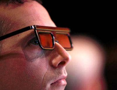 An attendee watches the 3-D-enhanced presentation of realtime applications of Nvidia graphics technology during CEO Jen-Hsun Huang's opening keynote at the GPU Technology Conference. Highlights included rendering of photorealistic still images via GPU-enabled ray tracing, a demonstration of physics-driven fluid mechanics and perhaps best of all, a mini-game that involved firing virtual crash test dummies at a computer-generated wall to shattering effect.