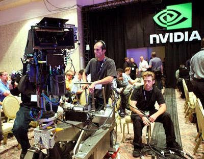 Camera operators prepare to dazzle GTC attendees with 3-D magic during the first part of Nvidia CEO Jen-Hsun Huang's opening keynote, which focused on the visual computing innovation for which the company is most famous. Later portions of the keynote were presented in more straightforward fashion -- in recent years Nvidia has sought to push its mission far beyond gaming and graphics, developing its CUDA programming language for general purpose-GPU (GP-GPU) computing and growing an ecosystem of academics, developers and system builders focused in areas such as medical imaging, geology and cloud computing.