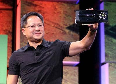 Nvidia CEO Jen-Hsun Huang, delivering the opening keynote at GTC Wednesday, holds up a graphics card built around the company's next-generation GPU architecture, code-named Fermi. Nvidia has not revealed a shipping date or pricing for Fermi-based products, which would succeed the GeForce GTX 280 and other products based on the chip maker's current, 10th-generation G80 microarchitecture. But several Nvidia partners exhibiting products at the conference suggested April as a likely time frame.