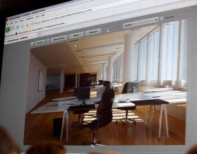 Nvidia wows the crowd with Iray, a turnkey rendering solution for 3-D graphics application developers built by its subsidiary Mental Images. Here, Iray is used to stream a hosted, photorealistic mock-up of an office space over the Web as an example of a cloud computing application that architects and designers could use to show clients their work. Iray creates "beautiful images" that can't be distinguished from photographs, said Jen-Hsun Huang, while Nvidia graphics horsepower allows new image views to be rendered in mere seconds.