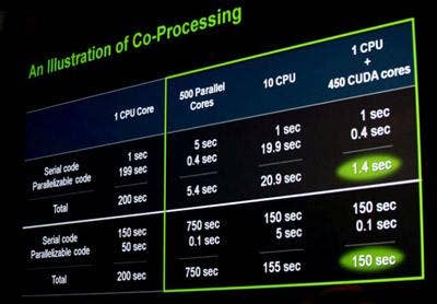 Nvidia sells its "co-processing" message with an illustration of time efficiencies that would be gained by taking a processing job and using the CPU to muscle through the serial code portion while the GPU tackles the portions that lend themselves to parallel programming. "It's always been 'A' or 'B,' " said Nvidia CEO Jen-Hsun Huang, referring to the programming of code for either central processors or graphics processors. "But why can't we have 'A' and 'B?' "