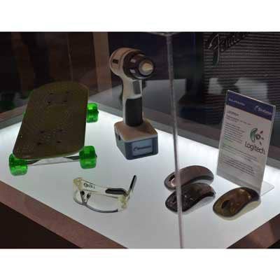 Need a new cover for an aging but otherwise perfectly functional computer mouse? Stratasys has it covered. The 3-D printing company teamed up with peripheral maker Logitech to generate replacement mouse covers. In addition, Stratasys showed off a fully functional skateboard made almost entirely from 3-D printed plastic, among other items.